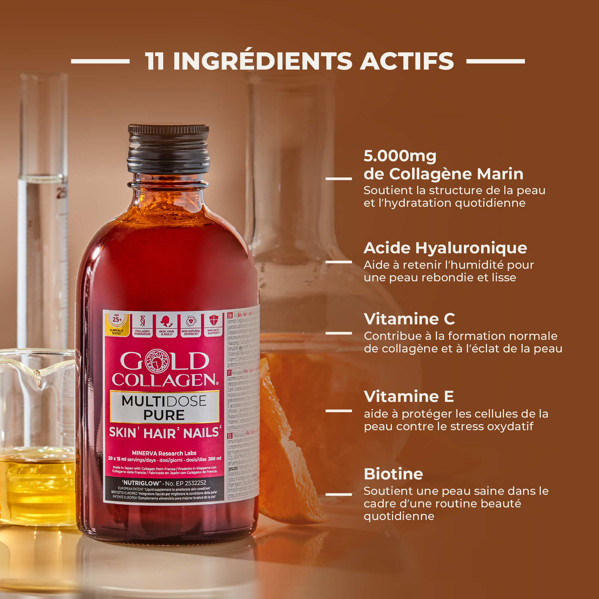 Gold Collagen® Multidose Pure is a liquid collagen formula designed to support daily skin hydration and overall skin appearance in a convenient multidose format.