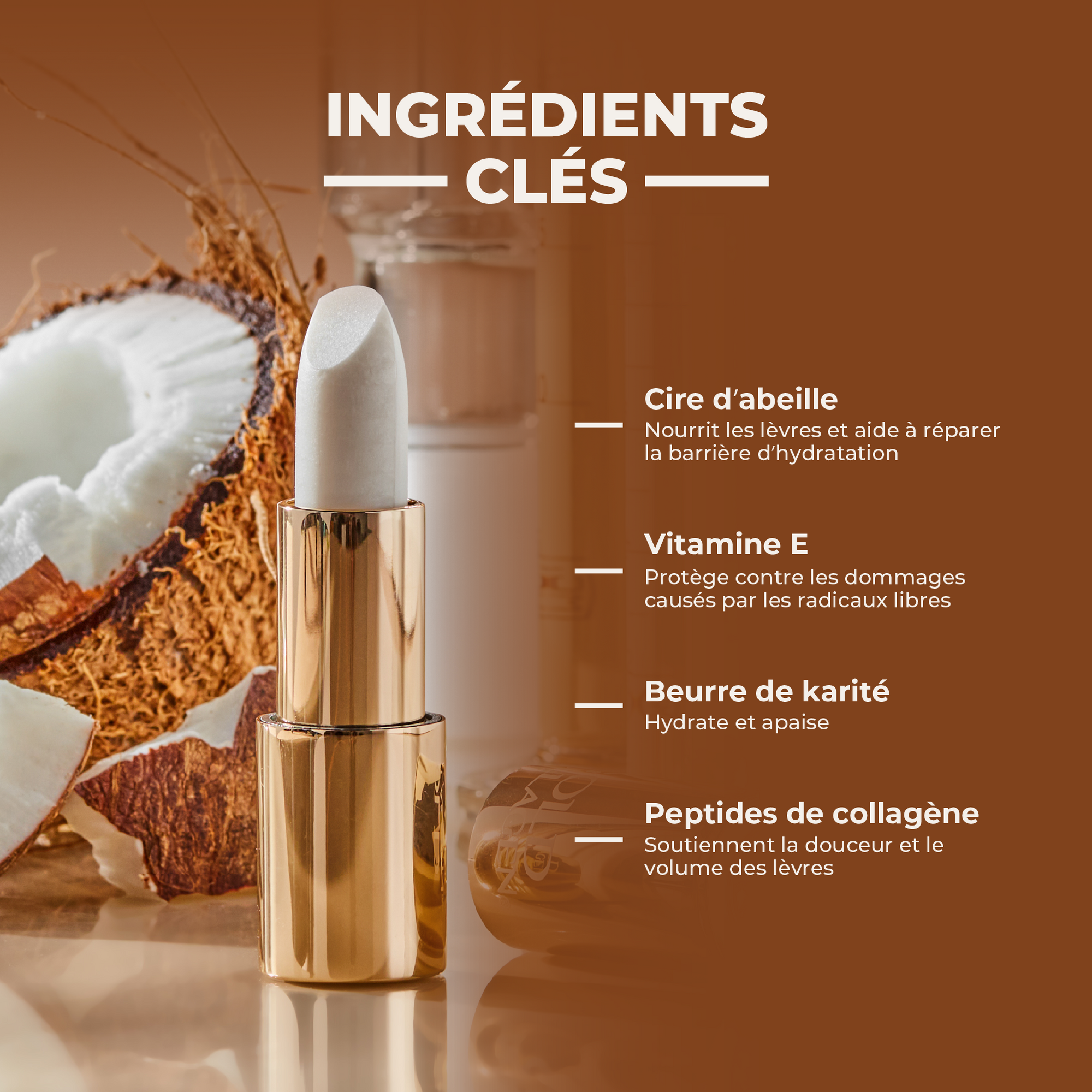 Beeswax Oligopeptides blend Vitamin E Shea Butter Collagen Peptides COCOYL, MATRIXYL® 3000 y MAXI LIP ™