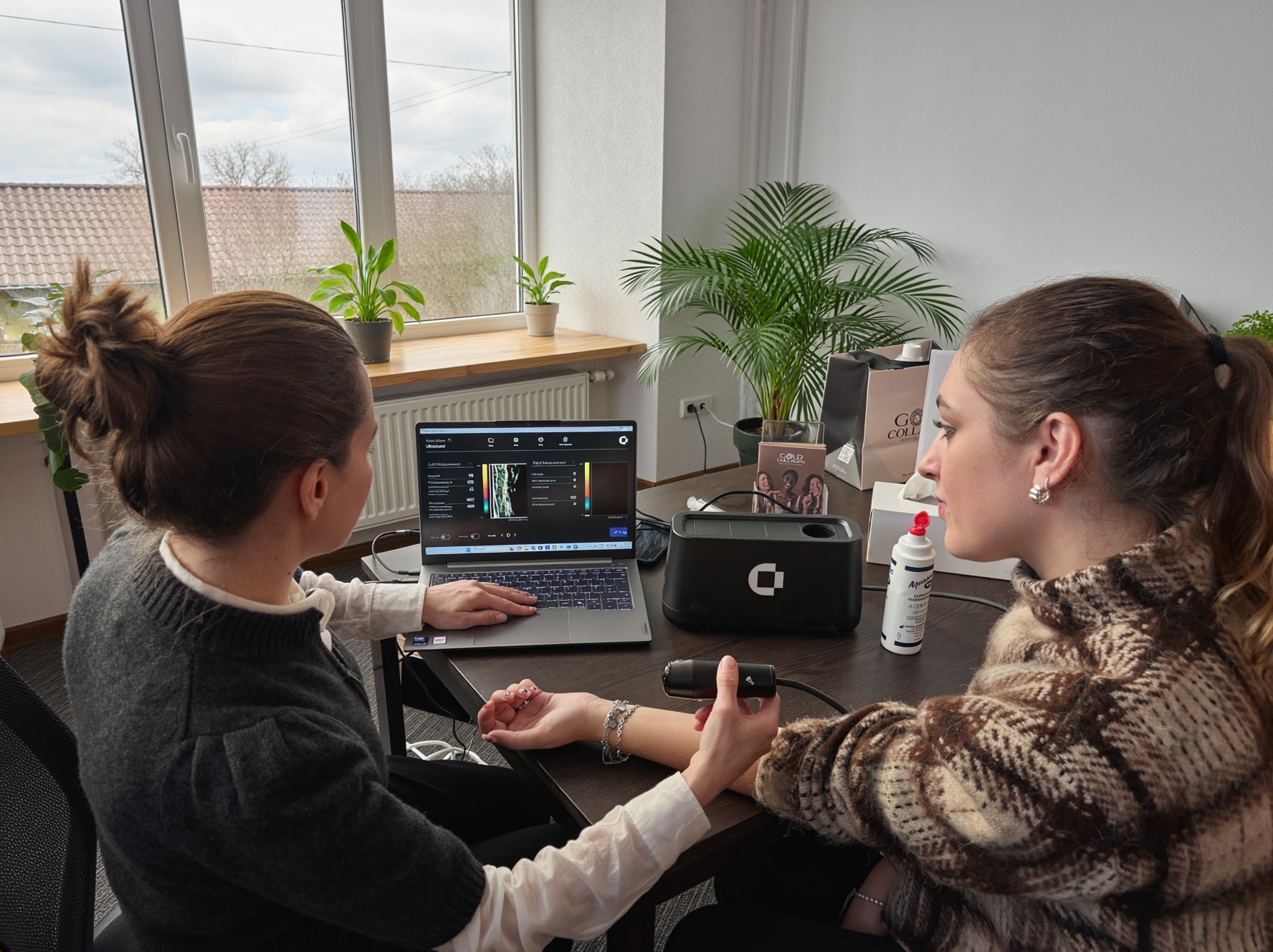 During your consultation, the DermaLab test itself takes about two minutes, followed by a few minutes with our expert for a personalised analysis and tailored advice to support healthy, youthful-looking skin and overall wellbeing.