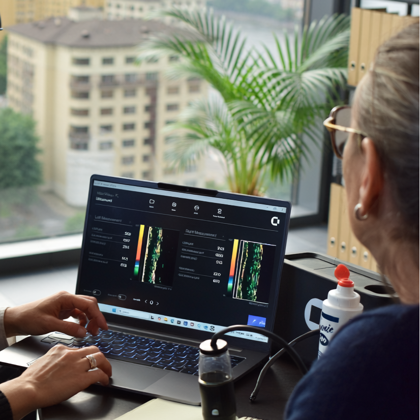 A gentle acoustic pulse is sent into the skin using an ultrasound probe, which is placed on the forearm. Part of the signal is reflected back, creating a precise image of the skin’s layers. This allows us to measure collagen density safely and accurately, with no discomfort or side effects.