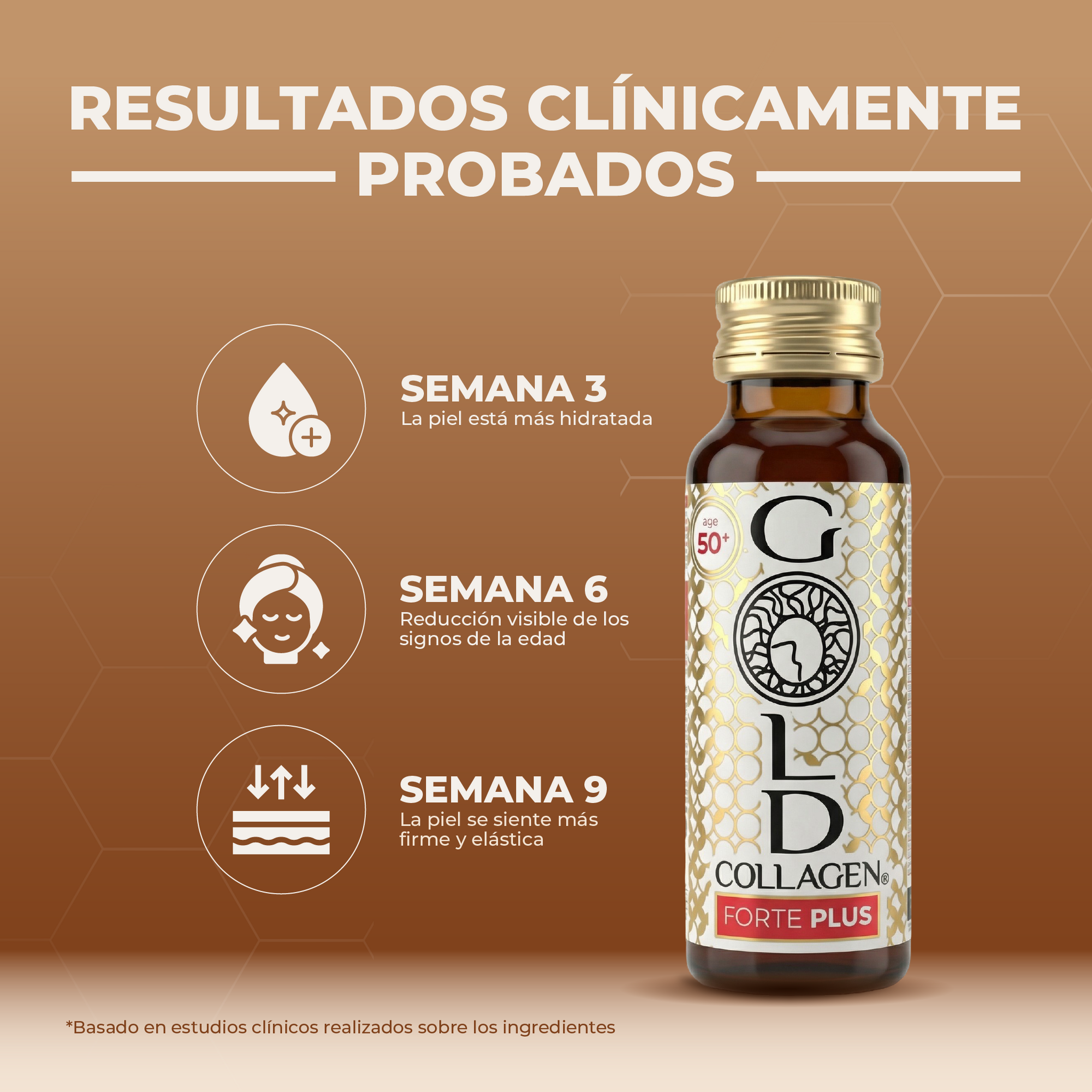 GOLD COLLAGEN® FORTE PLUS es una fórmula líquida de colágeno desarrollada para apoyar la piel durante etapas clave de cambio, especialmente asociadas al paso del tiempo y a las variaciones hormonales.