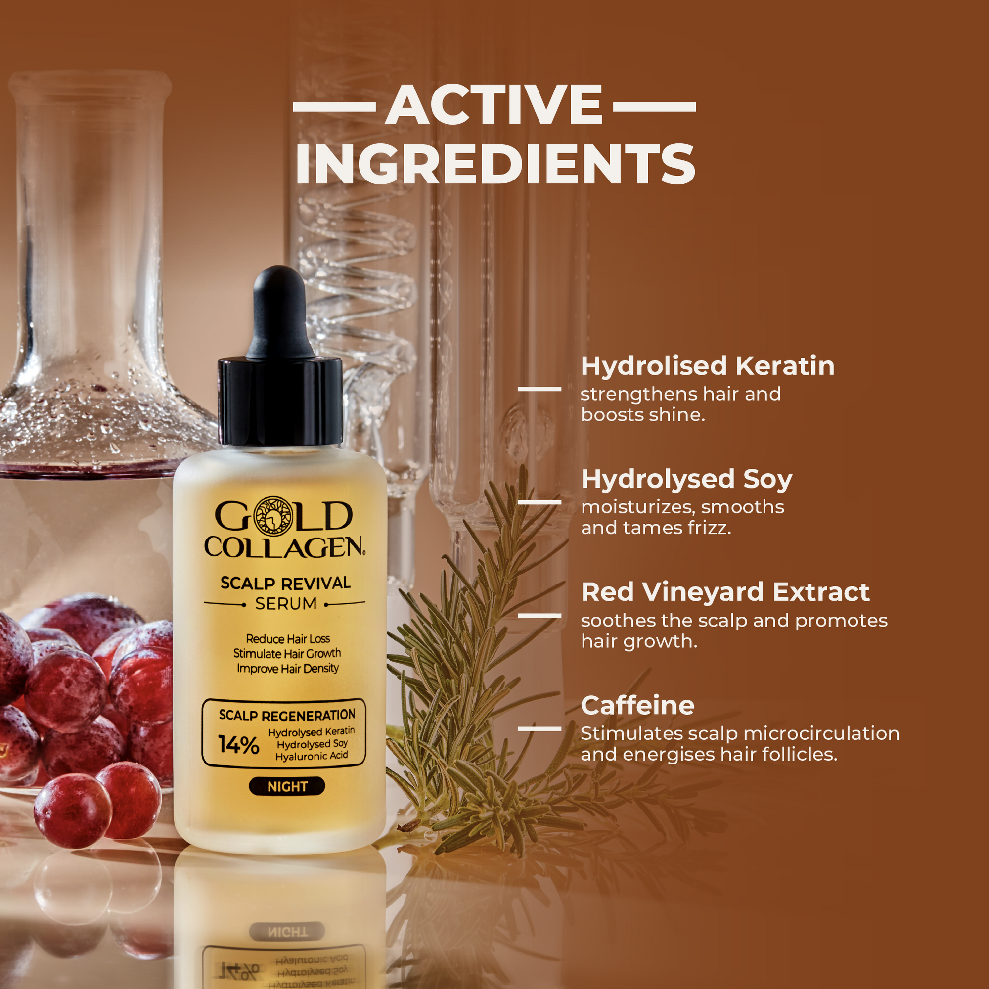 Gold Collagen® Scalp Revival Serum is a leave-in scalp treatment developed to support scalp balance and comfort.