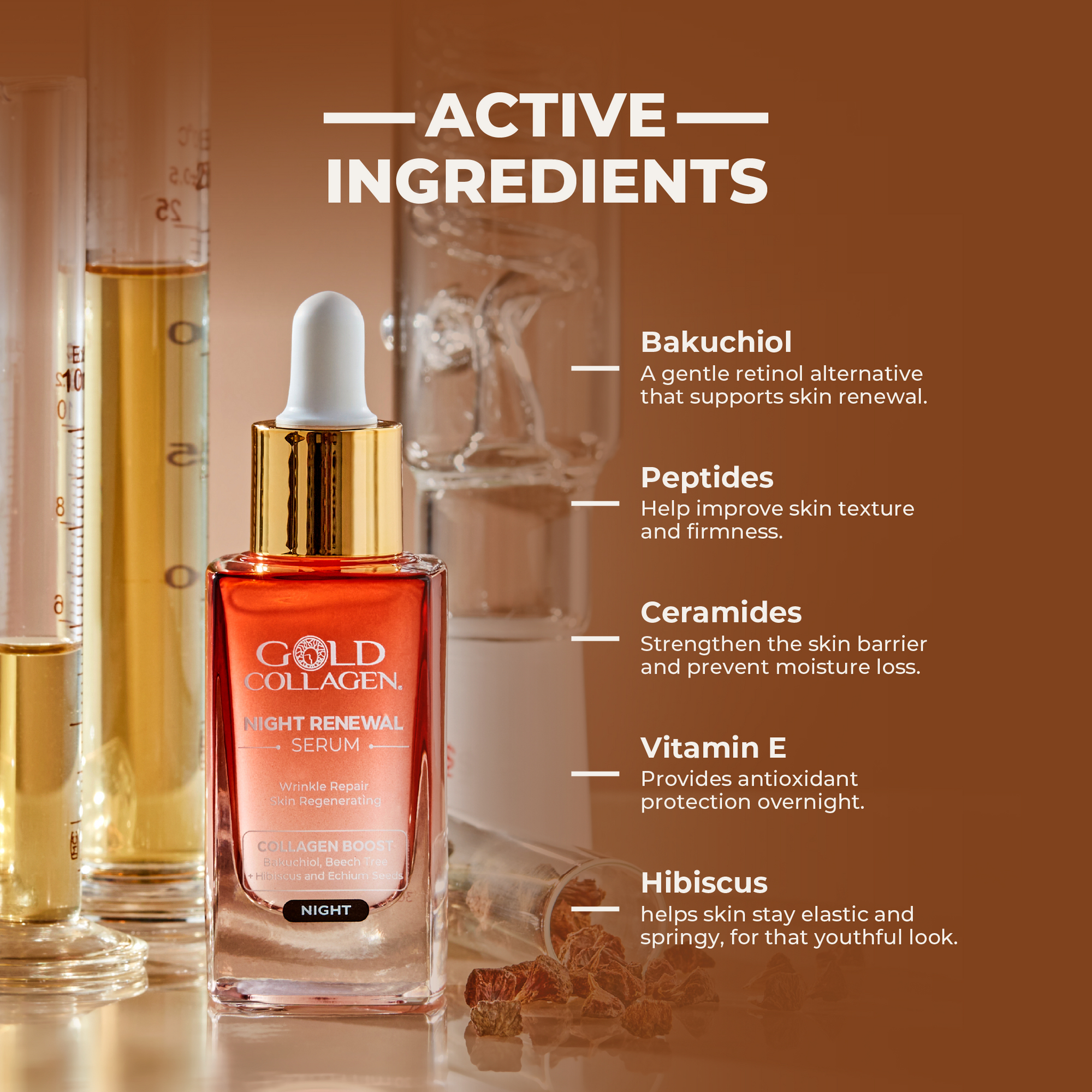 GOLD COLLAGEN® NIGHT RENEWAL SERUM é um tratamento noturno desenvolvido para apoiar a renovação da pele enquanto dorme.